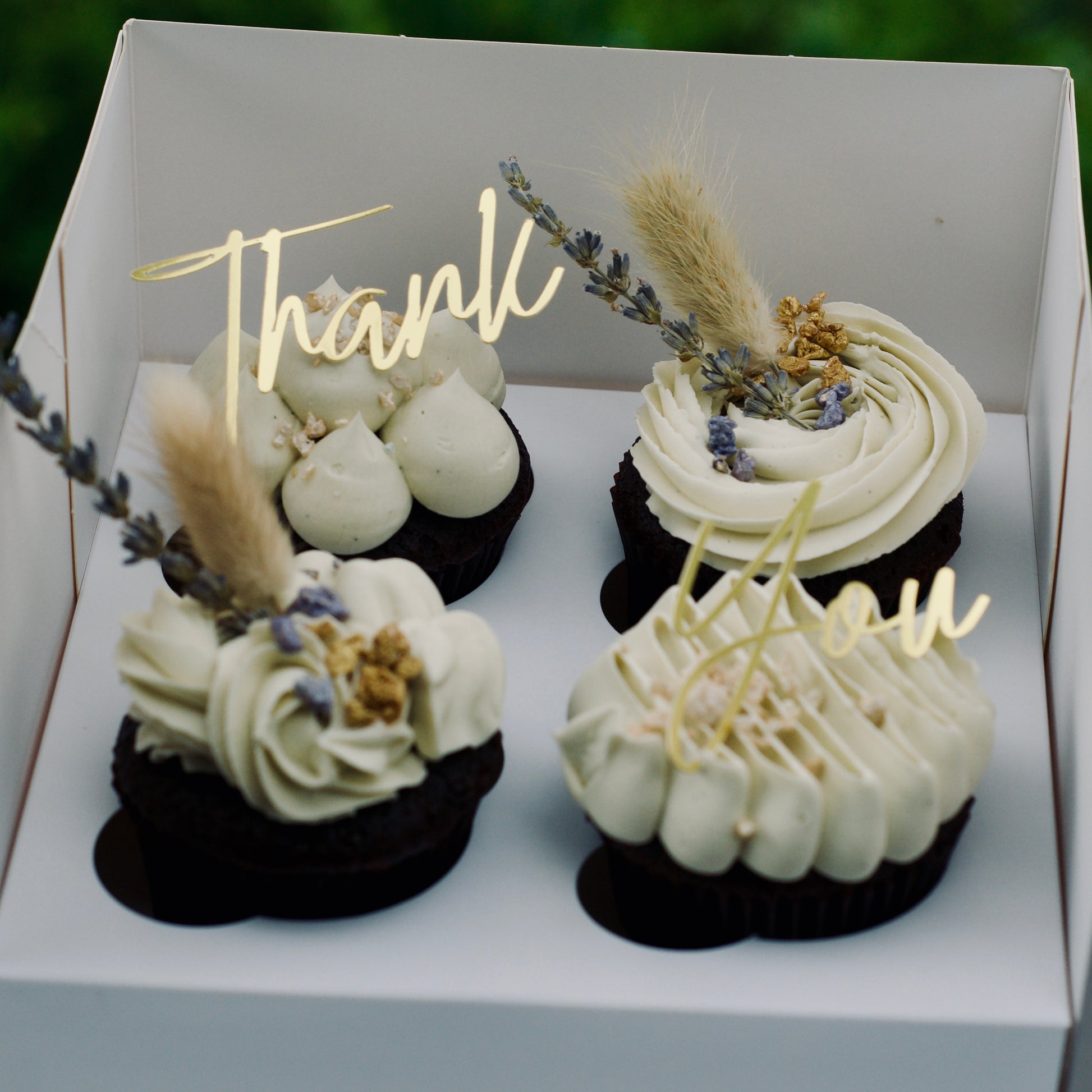 Make someone's day with our Thank You Cupcakes—a pack of four individually crafted treats in your choice of vanilla or chocolate. Each cupcake is topped with elegant white buttercream, adorned with delicate dried flowers and subtle gold accents that elevate the whole experience. Choose between "Thank You" and "The Best" toppers to match the occasion. They're beautiful enough to impress yet approachable enough to actually enjoy. A gift that feels thoughtful without being over the top
