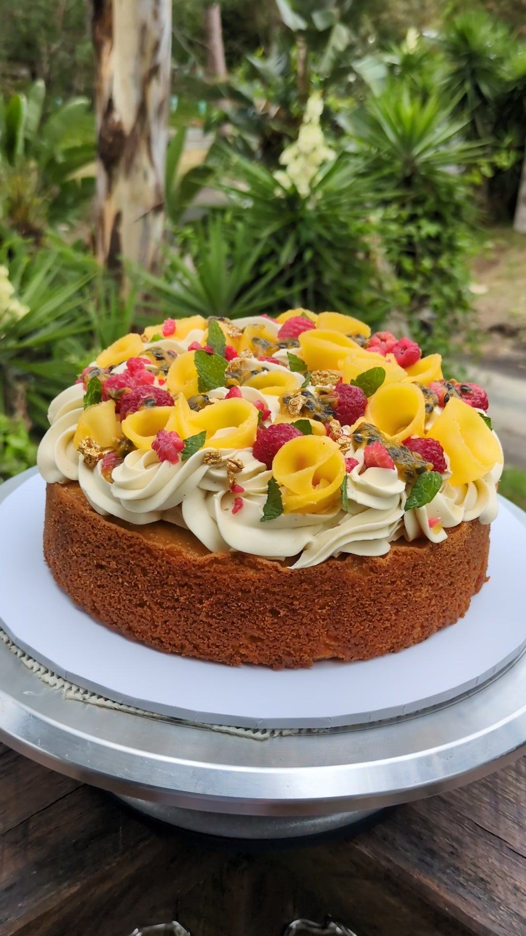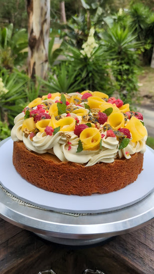 Discover the perfect way to celebrate Christmas with the Tropical Christmas Cake! Deliciously crafted with my signature vanilla cake base, smooth and velvety buttercream swirls, topped with mango slivers, crushed raspberries, passionfruit and mint. Enjoy the passionate combination of sweet and tangy flavors that will tantalize your senses. Perfect for any Christmas get together, this delectable cake will surely bring delight! Also available as Gluten free. (Made in the same kitchen as items containing Gluten)